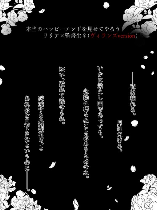 47 440 リリ監♀(🦇🌸)take② 監督生が帰っちゃって残されたリリア様のお話。※不穏、模造注意 【ヴィランズendバージョン。】 「本当のハッピーエンドを見せてやろう」全7ページ(7/7) #twstプラス #ツイステプラス 20/07/06 00:42