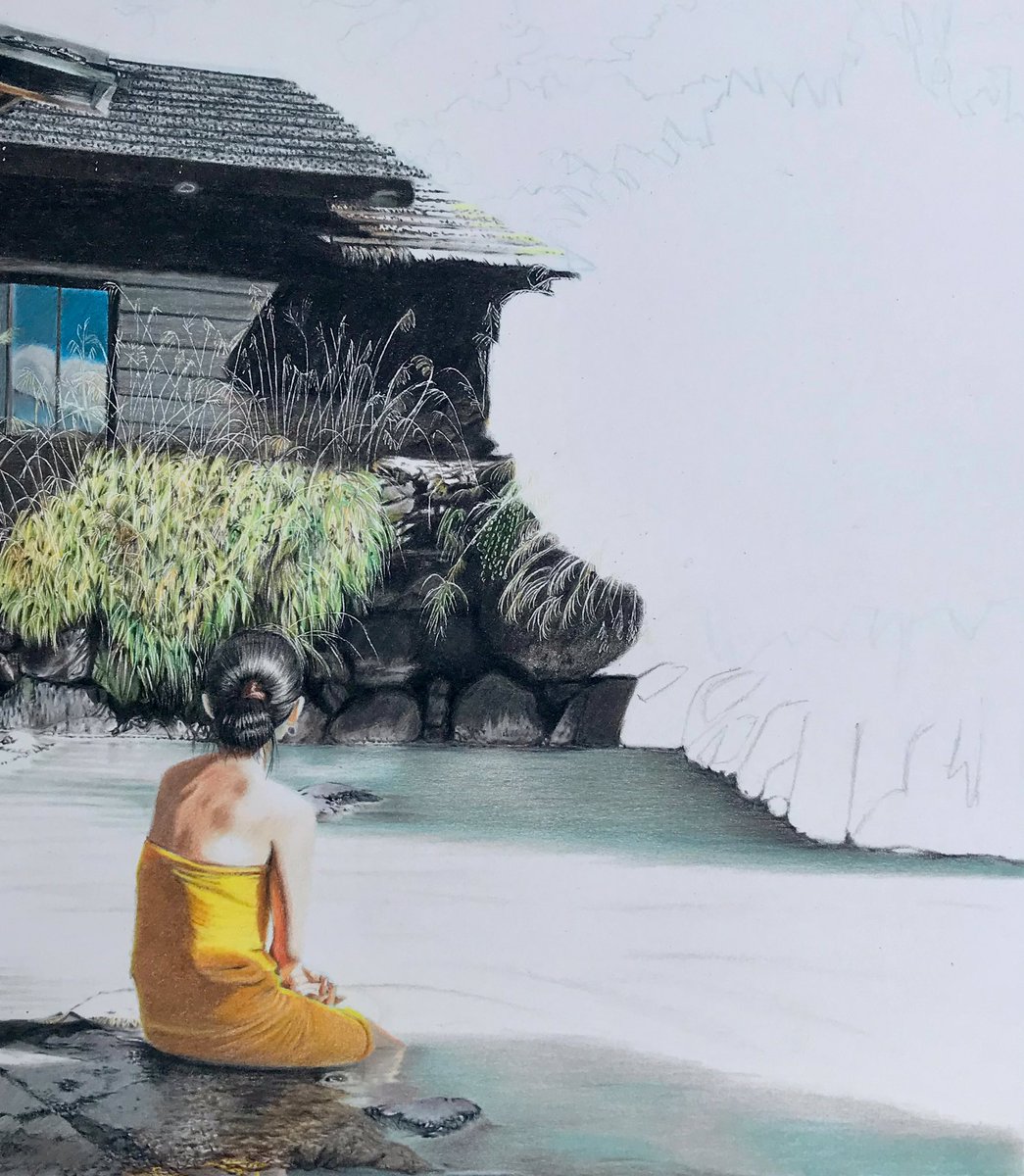 WIP 2 🔶 Young lady bathing in a hot spring. #onsen #japanesehotspring #realism #drawingoftheday #coloredpencil #coloredpencils #vieaujapon #japanesebath #japanesewayoflife #色鉛筆画 #イラスト #温泉 #日本の温泉 #つるのゆ