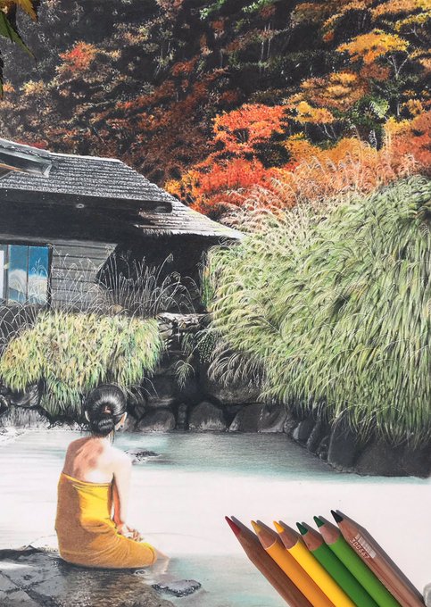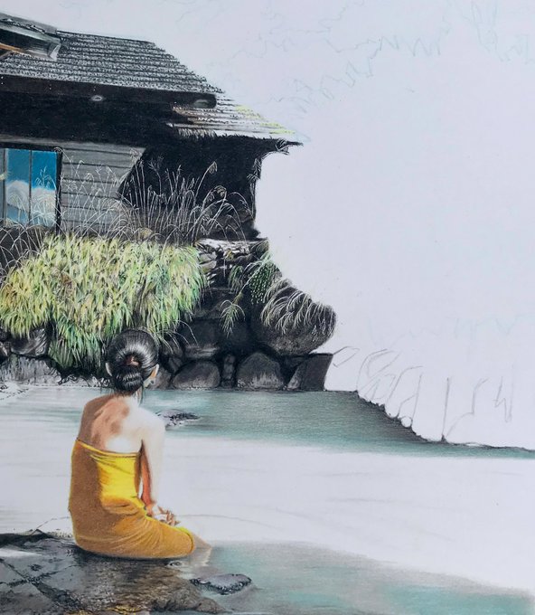 A peaceful moment at a hot spring ♨️ #温泉 #日本の温泉 #湯 #色鉛筆画 #イラスト #coloredpencil #drawingoftheday #traditionalart #japanesehotspring #onsen #landscapepainting #beautifullife #QuietTime #Bath #drawing #Japan