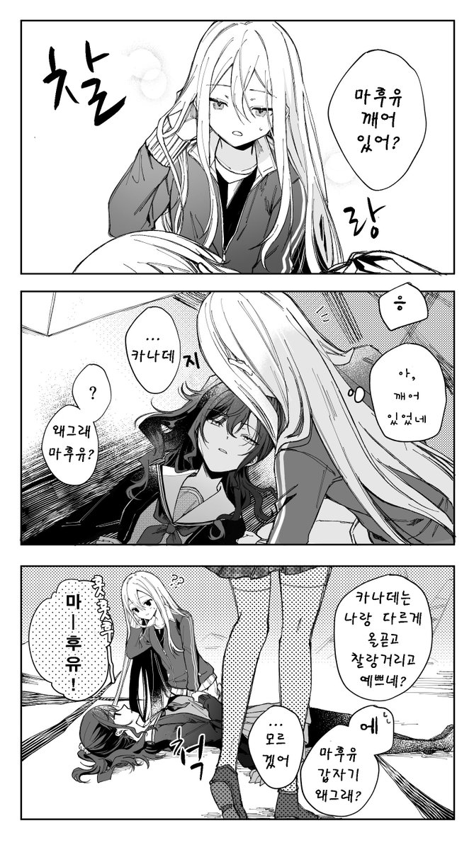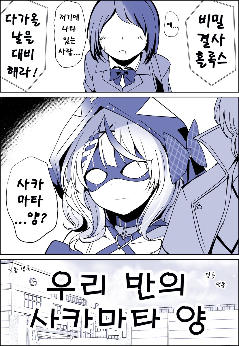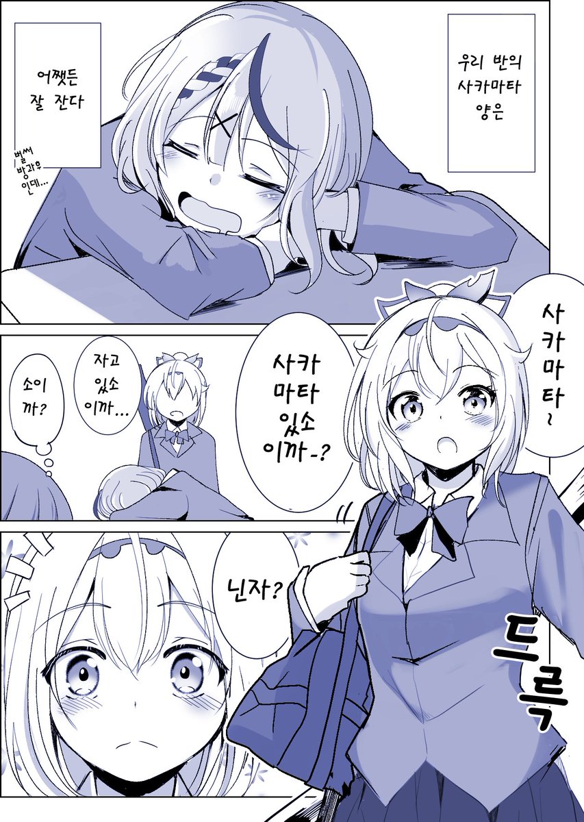 원본 : twitter.com/kuzirazio/stat… 우리 반의 사카마타 양②(1/2) 옆반의 카자마 양 #さかまた飼育日記 #いろはにも絵を 작가 : くじらじーお(@kuzirazio)