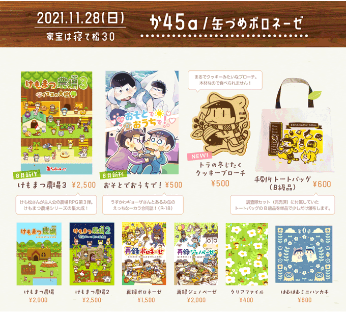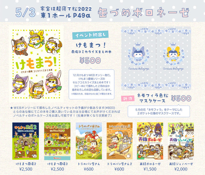 5月3日の超家宝のお品書きです!新作マスクケースの絵柄が当日のポスターになってます。12月の新刊はリアルイベント初出しです🐯とらさん通販も再入荷してましたのでご入用の方はこちらもぜひ〜✨ ecs.toranoana.jp/joshi/ec/item/…
