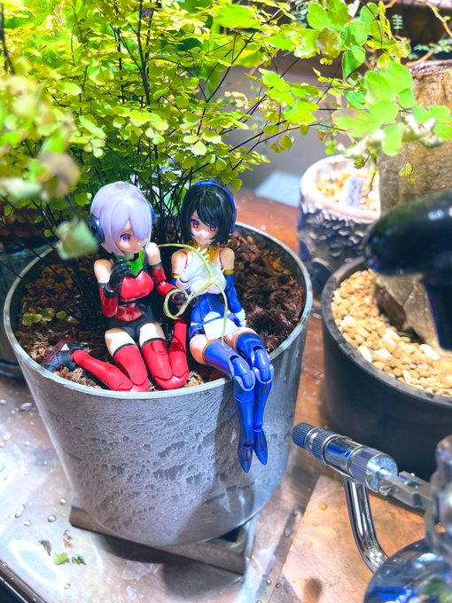 ちょっとしたライトがつくジオラマみたいなの欲しい〜って思ってたんだけど、ライトつけた植木鉢棚に入ってもらうととても雰囲気いい!1/1ならではだよねえ かわいっ #メガミデバイス