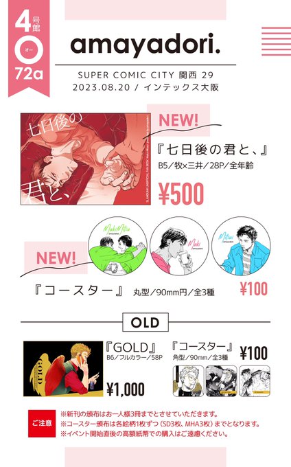 6 21 【インテお品書き】 新作は新刊1冊、コースター3種です。よろしくお願いします🤲 既出のものは全てMHAのものになります!館が違いますので、そちらご利用の方はご注意ください。 下記ツリーにて新刊サンプル等繋げます。 23/08/11 23:23