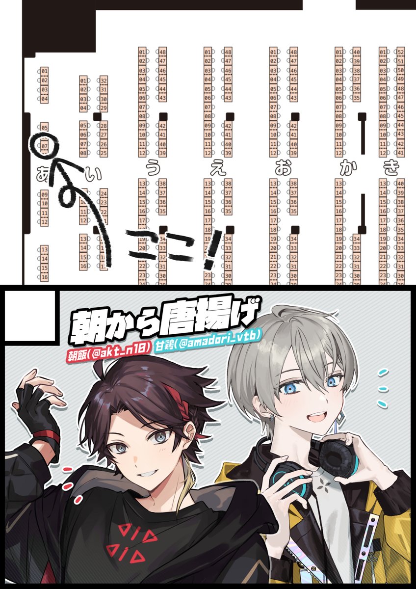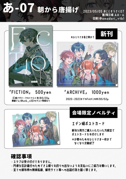 #にじそうさく07 お品書き 【あ-07】朝から唐揚げ 朝飯さん(twitter.com/akt_n10)との合同サークルで参加します!2年半ぶりだ~! 新刊2冊で対戦予定です、当日はよろしくお願いいたします🙇♀️