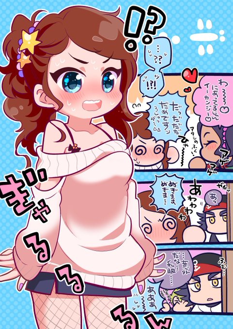 くーよんさん(@fangwy)の照さん&はれるちゃんを描きました!!!腕にあたる…なにかおおきな感触が……………………🤔