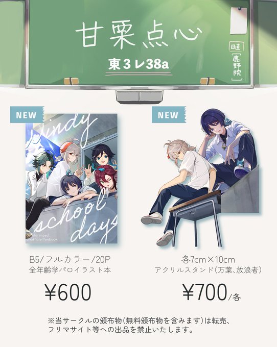 スパコミ 30 5/3 超神ノ叡智 【東3レ38a】◆甘栗点心 お品書きです~! ◆風男子学パロイラスト本(新刊) ◆アクスタ2種(万葉/放浪者) 記載価格は会場価格となります。 後日Boothにて通販を予定しています📦 宜しくお願いいたします🍃 amaguriya88.booth.pm
