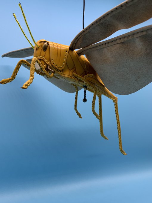 【サバクトビバッタのペンケース】 英名Desert locust 不定期に大発生し、広域に飛翔して深刻な農業被害をもたらす移動性害虫の一種。 西アフリカから中東、インドまでの南西アジアにかけて広く分布する。 本種の生態と防除技術の研究については前野ウルド浩太郎氏の著書及び国際農研のHPに詳しい。