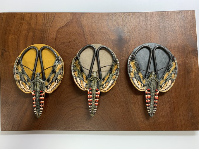 196 776 【エビガラスズメのハサミ入れ】 Agrius convolvuli 5-11月に日本全国で見られる夜行性の蛾。長い口吻で筒状の花の蜜を吸う。85㎜前後。腹部の模様が美しい。 背景は月をイメージして、満月と新月と朧月みたいな3色の牛革にしました。 未使用時は口吻(丸牛ヒモ)を穴に通して、鋏の脱落を防止します。 22/09/19 18:41
