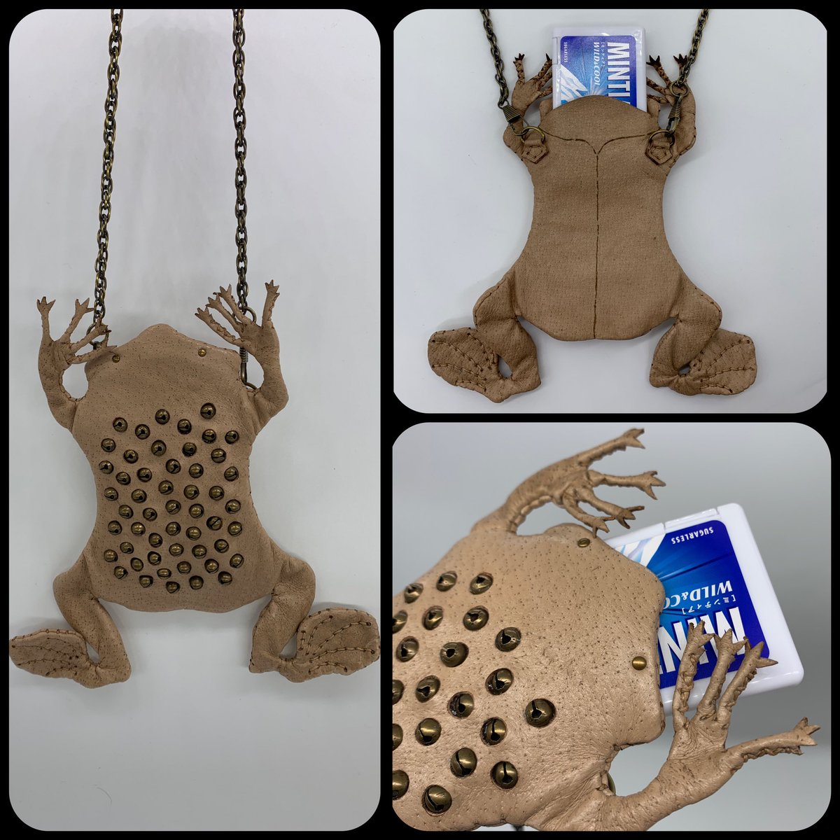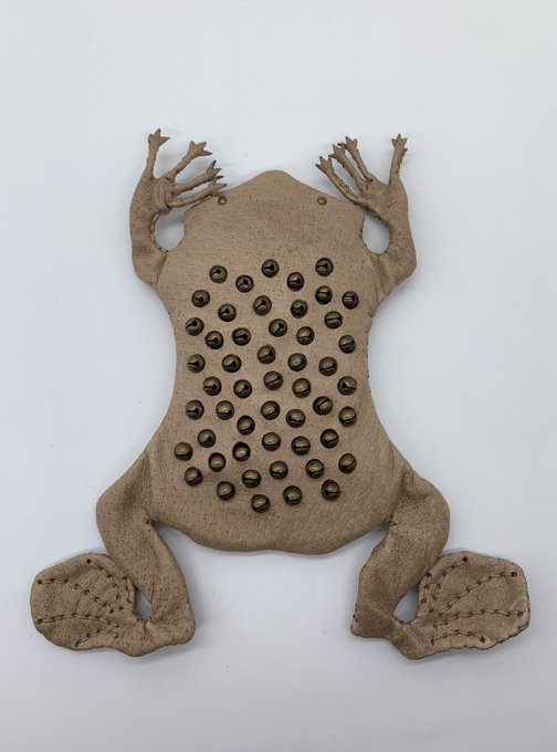 【コモリガエルのポーチ】 Pipa pipa アマゾン川流域に生息するひらべったいカエル。体長15㎝。 前脚の指先が星形の感覚器官で、バンザイの姿勢で枯葉のように川底にひそむ。 メスは背中の皮膚に受精卵を埋め込んで、孵化→オタマジャクシ→仔ガエルになるまで育てることで有名。 ※作品は実物大