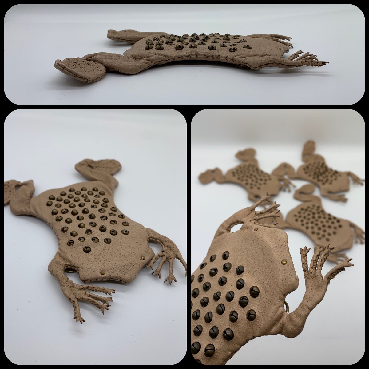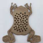 37 125 【コモリガエルのポーチ】 Pipa pipa アマゾン川流域に生息するひらべったいカエル。体長15㎝。 前脚の指先が星形の感覚器官で、バンザイの姿勢で枯葉のように川底にひそむ。 メスは背中の皮膚に受精卵を埋め込んで、孵化→オタマジャクシ→仔ガエルになるまで育てることで有名。 ※作品は実物大 23/03/18 17:42