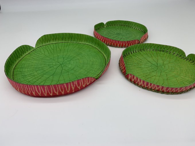 261 649 【オオオニバスのポットマット】 Victoria amazonia 大鬼蓮 アマゾン川流域に生育するスイレン科の水生植物。 2メートル以上にもなる巨大な葉が、水面にズラリと浮かんでいる光景は圧巻。 上に乗って昼寝したい。 ※ 鍋敷ではないので直火ポットや水滴のついたコップなどには使用できません。 23/03/26 10:54