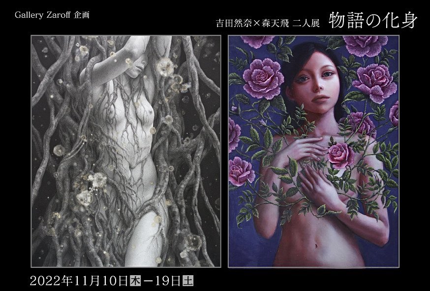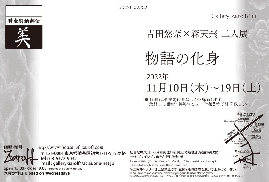2人展開催中です 16日(水)は休廊のためご注意ください 吉田然奈×森天飛 二人展 【物語の化身】 11.10(木)-19(土) 13時-19時 ※水曜休廊/最終日17時まで 画廊・珈琲 Zaroff house-of-zaroff.com 時間未定ですが19日在廊予定です。 ザロフさんはココアが美味しいので、そちらもお勧めです。