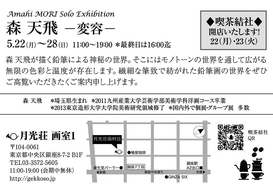 一週間後となりました個展 お立ち寄りいただければ幸いです。 【森 天飛 -変容-】 5月22日(月) - 28日(日) 会期中無休 11:00-19:00 / 最終日16:00迄 ▶︎月光荘 画室1 東京都中央区銀座8-7-2 B1F ▶︎お問合せはすみれ画廊まで info@gallerysumire.com ▶︎詳細 gallerysumire.squarespace.com/jp/shop/amahi-…