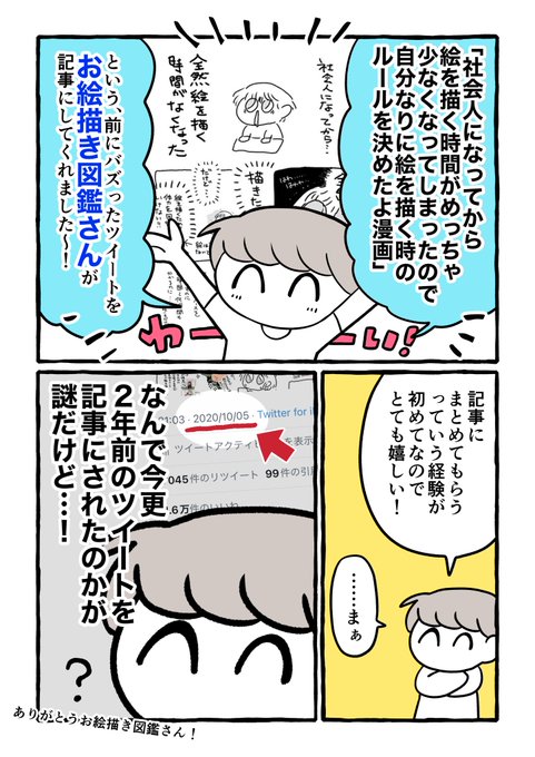 お絵描き図鑑さん(@oekaki_zukan )にて2年前のバズツイを記事にしてもらいました! ありがとうお絵描き図鑑さん! 描いてある精神は今も継続してます! 記事はこちら▼ 【イラストの悩み】絵を描く時間がないときの対処法。3つのルールを決めて創作をしよう|お絵かき図鑑 oekaki-zukan.com/articles/42452