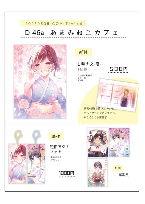 コミティア144お品書きです🌸 D-46aあまみねこカフェでお待ちしております! 当日詳細はこちら:fanbox.cc/@amamineko/pos… 新刊通販:melonbooks.co.jp/detail/detail.… #COMITIA144 #コミティア144