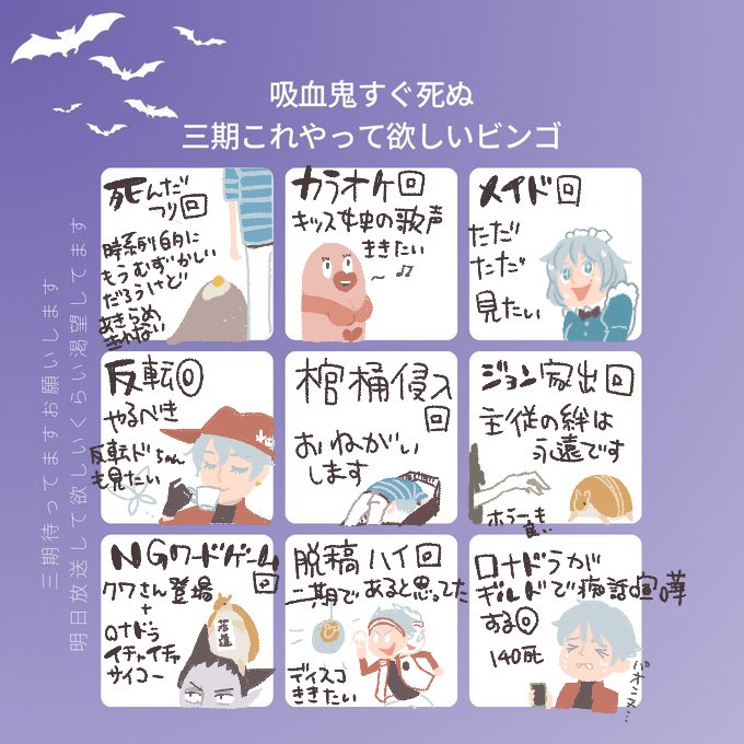 #三期これやって欲しいビンゴ テンプレお借りしました! 他にもメビ回とか死のゲェム回(乙女ゲ含)牛乳入りのお湯とか神先生過去回とかドちゃん分裂回とか他にもたくさん見たい。3期も4期もずっとやってくれ……
