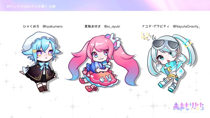 ⋆⸜ # RTしたVtuberさんを描く ⸝⋆ 応募してくださったみなさま ありがとうございました✨✨ ✦──────────✦ ひゃくめろ( #hyakumero ) 星飴あゆき( #sc_ayuki ) ナユタ・グラビティ( #NayutaGravity_ ) ✦──────────✦ 3名のSDイラストを描かせていただきました🤍 twitter.com/amamorichannu/…