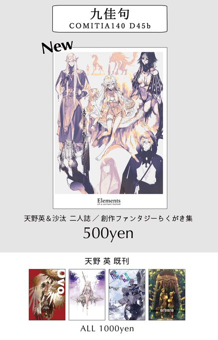5/5(木)コミティア140 『九佳句』D45b で参加します。 前回コミケで発刊した創作合同誌のほか、既刊4種とイラスト色紙(描けた数だけ)の予定です。よろしくお願いします~! #COMITIA140