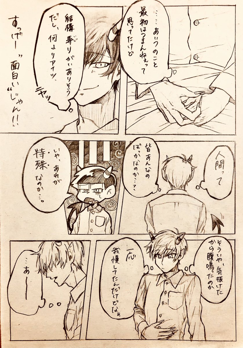 19 71 デビおその波に乗って過去絵🤗 自分が考えてる二次創作のお気に入り切り取った部分だからは?ってなると思うけど あいつ&あれ=神父様 一応カラおそ こんなんだけど風邪引いて神父様に看病してもらってるとこなんす 22/10/23 15:00
