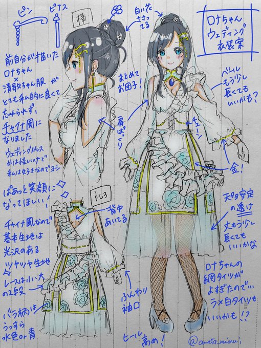 #パレプロウェディング お久しぶりのタグですね!!!! 7人目は七海ロナちゃん💙🦊 白青金を貴重にしたチャイナ風ドレスです!いつも通りめちゃくちゃポイント書き込みしてありますよ〜っ✨😌 あーとってほどじゃないので⬇️ #七海組