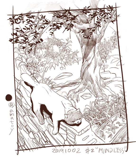 2 9 #inktober2019 "MINDLESS - ほとんど精神的な努力を必要としないさま" 手前の草は描いてるけど奥の草はクリスタのブラシ素材。便利ィー 19/10/02 22:49