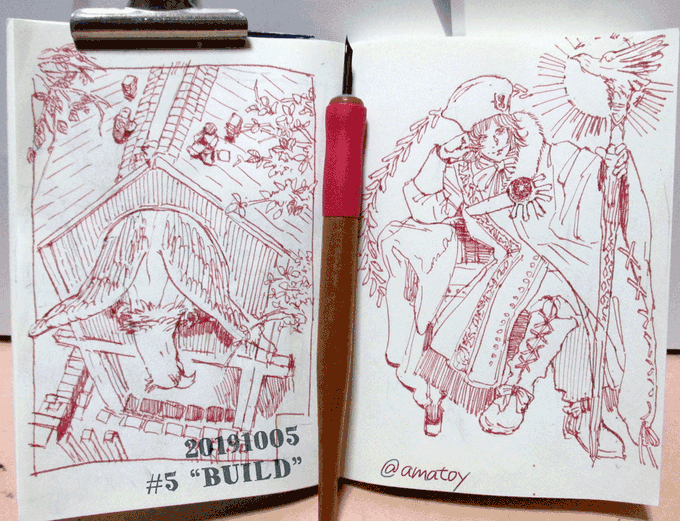 #inktober2019 "BUILD - 建設する" グリフォンの鳥小屋を作成中。右はギュスターヴ14世。丸ペン、ホルベインのドローイングインク。