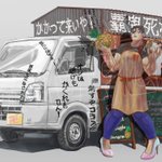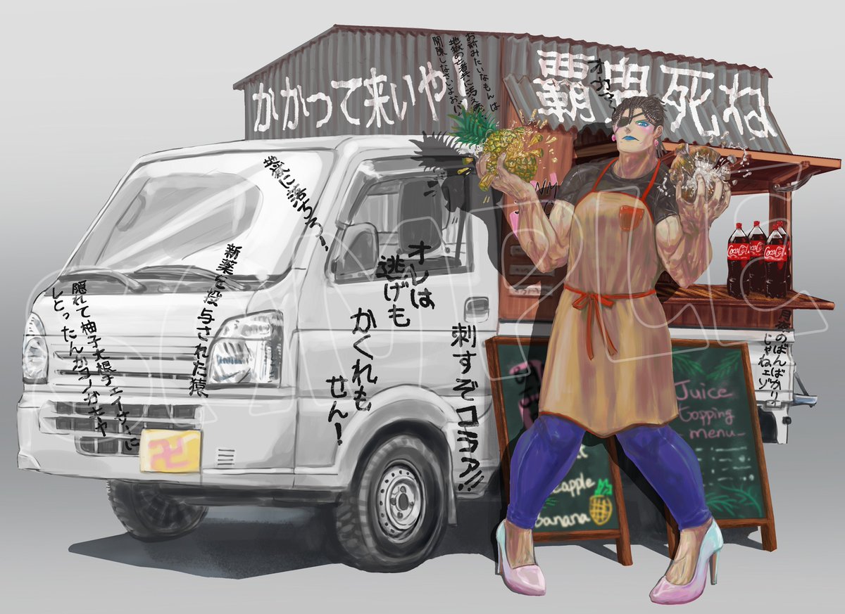 【ご依頼絵】 南国フルーツを握りつぶすムキムキなお姉さん(お兄さん)とキッチンカーを描かせていただきました。ありがとうございました!(某漫画が元ネタです。) #有償依頼 #Commission