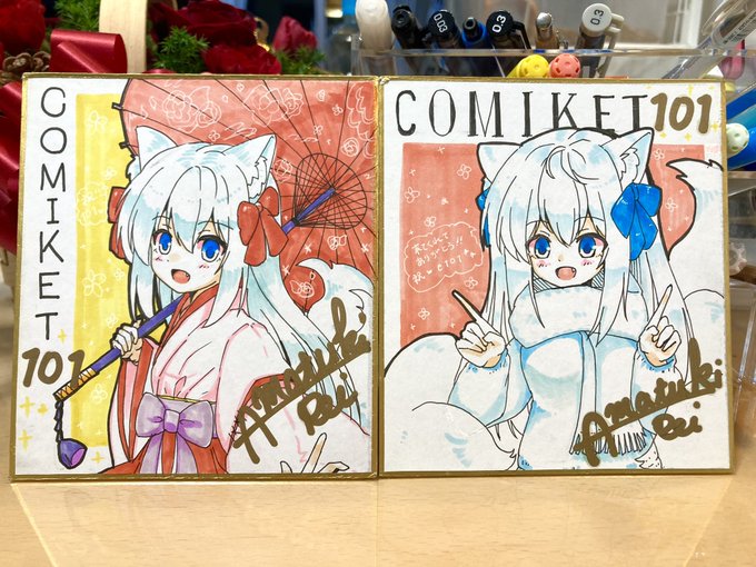 明日の色紙はなんとか滑り込みの2枚のみですが 気に入って頂けましたら是非新刊と一緒に持って帰っていただけると嬉しいです🥰 スペースでお待ちしてます✨ #C101 twitter.com/amatukirei/sta…