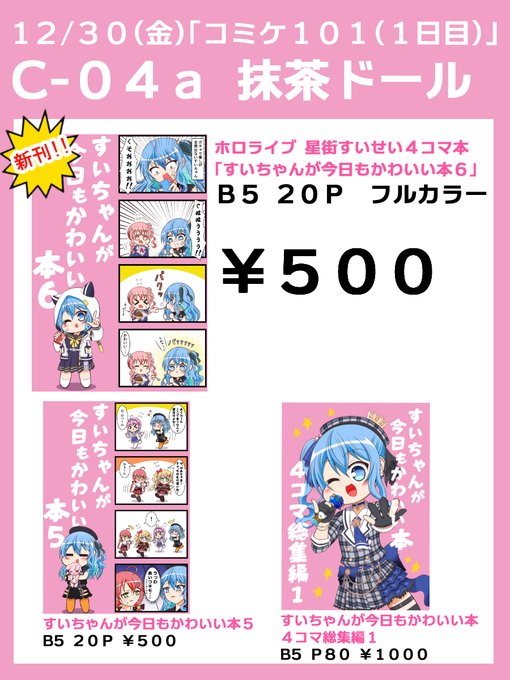 【新刊告知】12/30(金)のC101(1日目)、東C-04a「抹茶ドール」にて、 星街すいせいさんの4コマ漫画の新刊を出します!また、メロンブックスにて委託します! #星街すいせい #ホロライブ #C101 新刊 melonbooks.co.jp/detail/detail.… 既刊1 melonbooks.co.jp/detail/detail.… 既刊2 melonbooks.co.jp/detail/detail.…