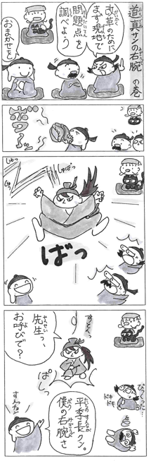 小学生から歴史オンチの大人まで!学問の神チャン菅原道真マンガ 『ポレポレ天神★ショートショート』 ■道真サンの右腕 の巻[038] #漫画が読めるハッシュタグ #平季長 ★画像2枚(左から読みます) ★解説はリプ欄