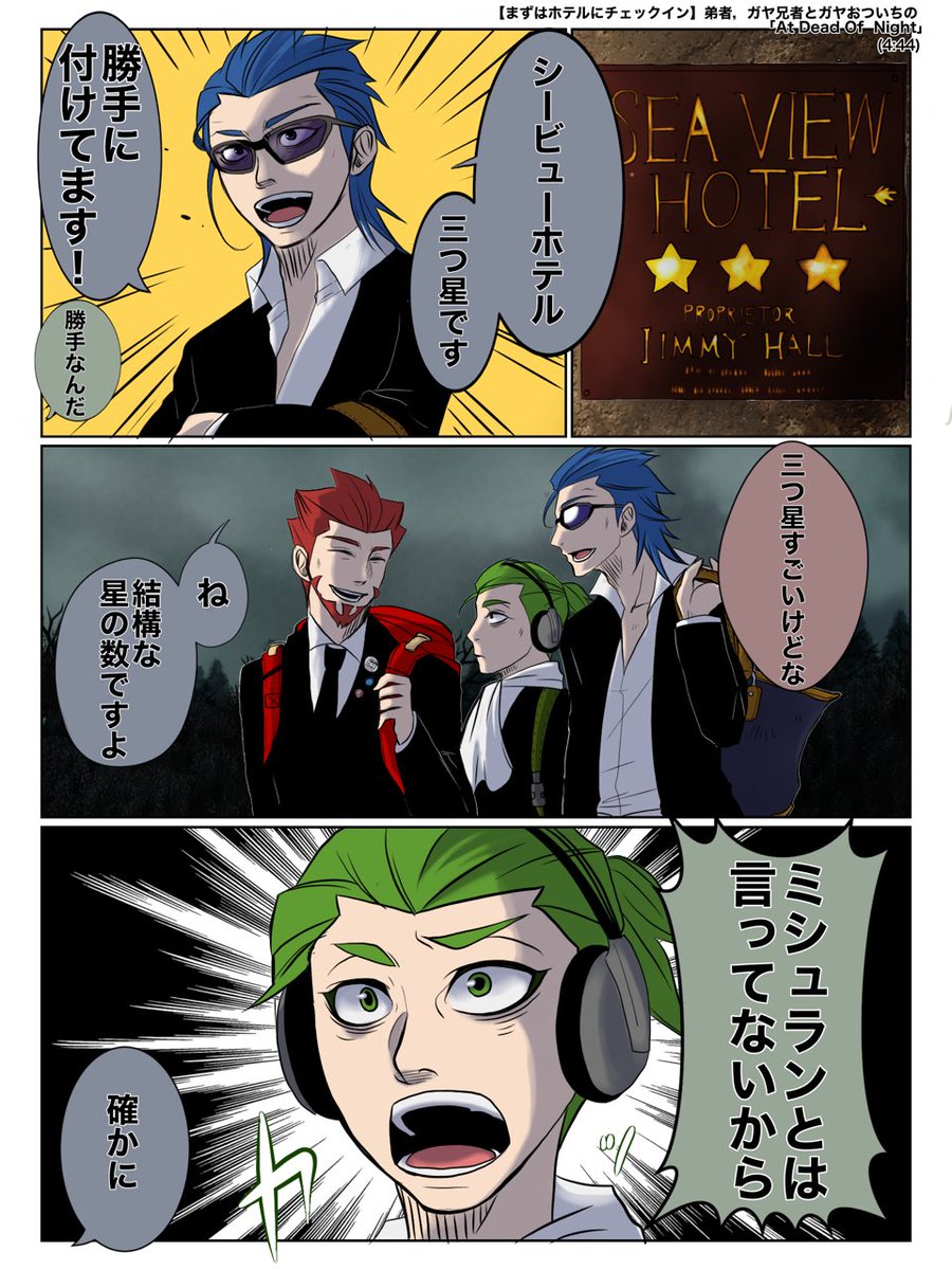 ジミーホテルからお気に入り場面3つ。 ①三つ星だと思ってないので滅茶苦茶言う兄ズ。 ②クローゼットを覗かれ『あ゛ー!』なゲリラ組とひたすら落ち着いてる兄。 ③霊体が子供だと分かってジミー絶対許さないマンになる優しい弟さん。