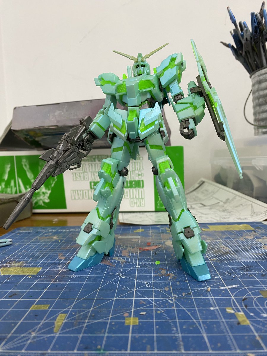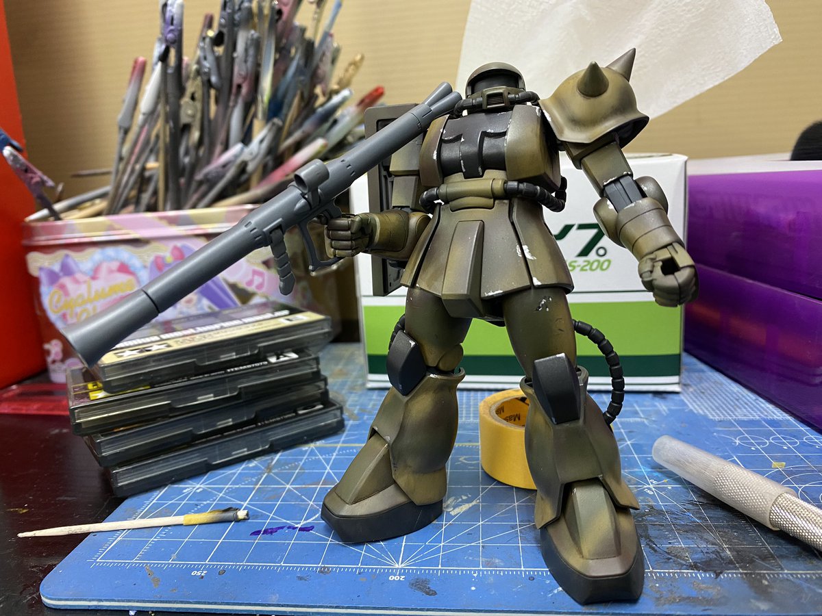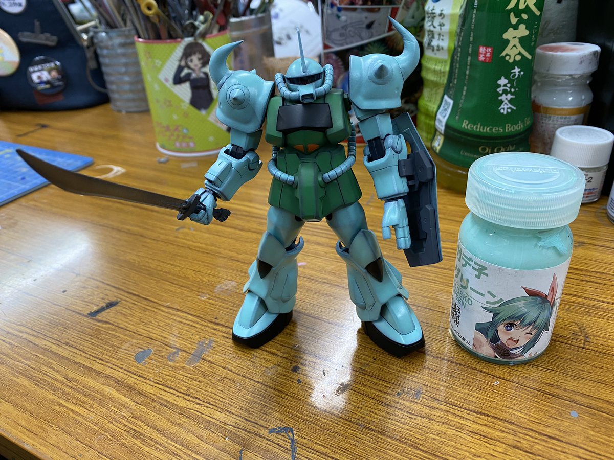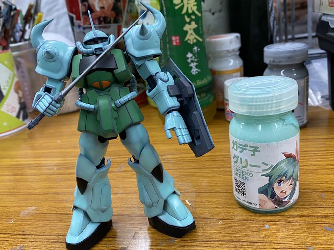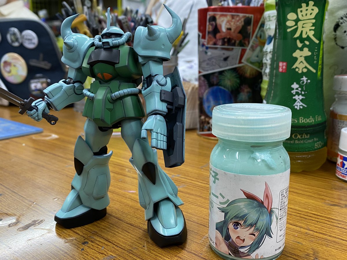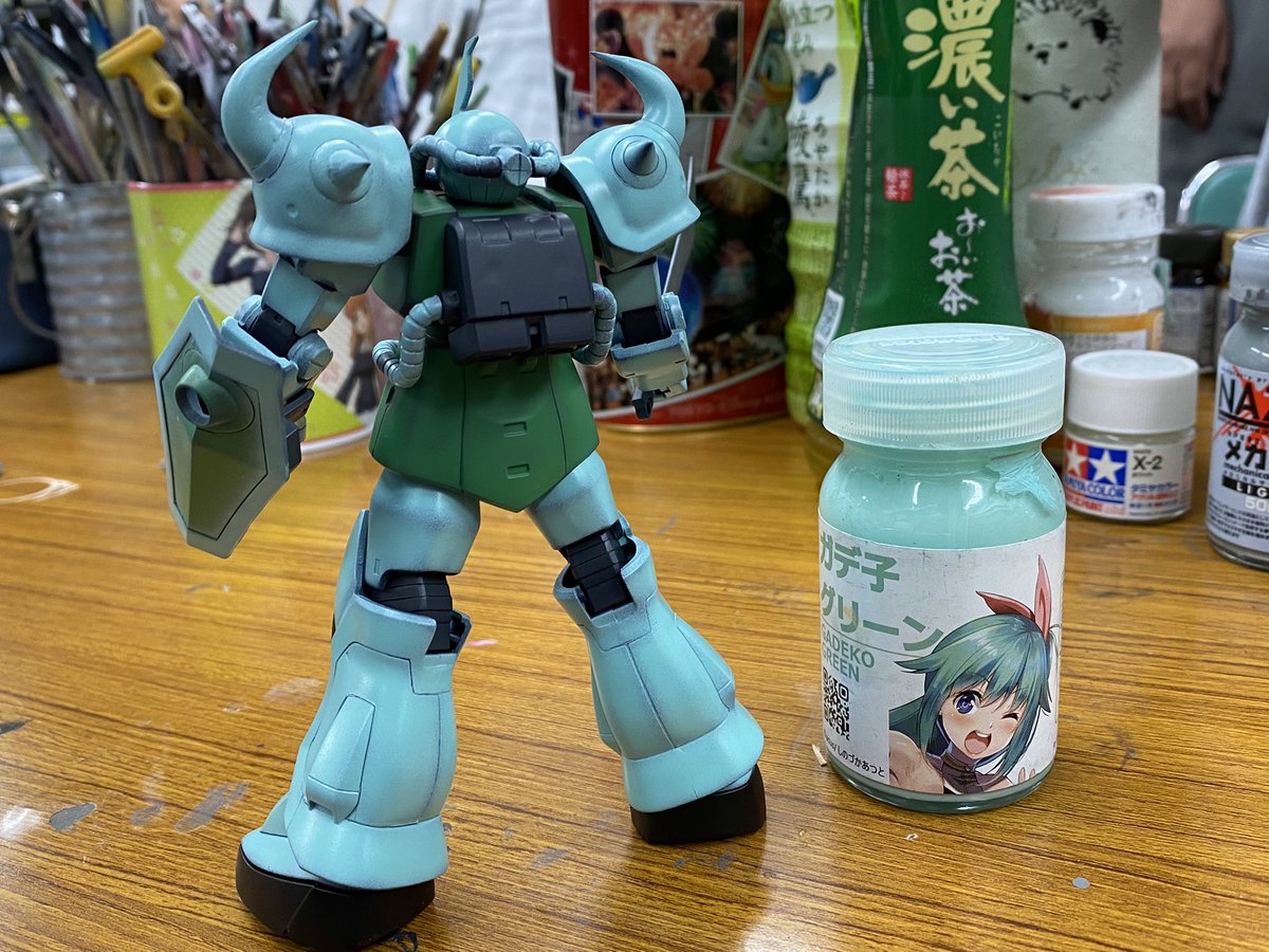 8 53 昨日塗れなかった胴体塗って エコプラのグフを完成。 ガデ子グリーンの凄さはエコプラの真っ黒な成形色でも負けない圧倒的な隠蔽力! 今後色んなイベントで再販してほしいです‼︎ 塗装はいつもお世話になっている #秋葉原工作室 さんにて #ガデ子グリーン展示会 #ガンプラ #gunpla 22/09/04 18:36