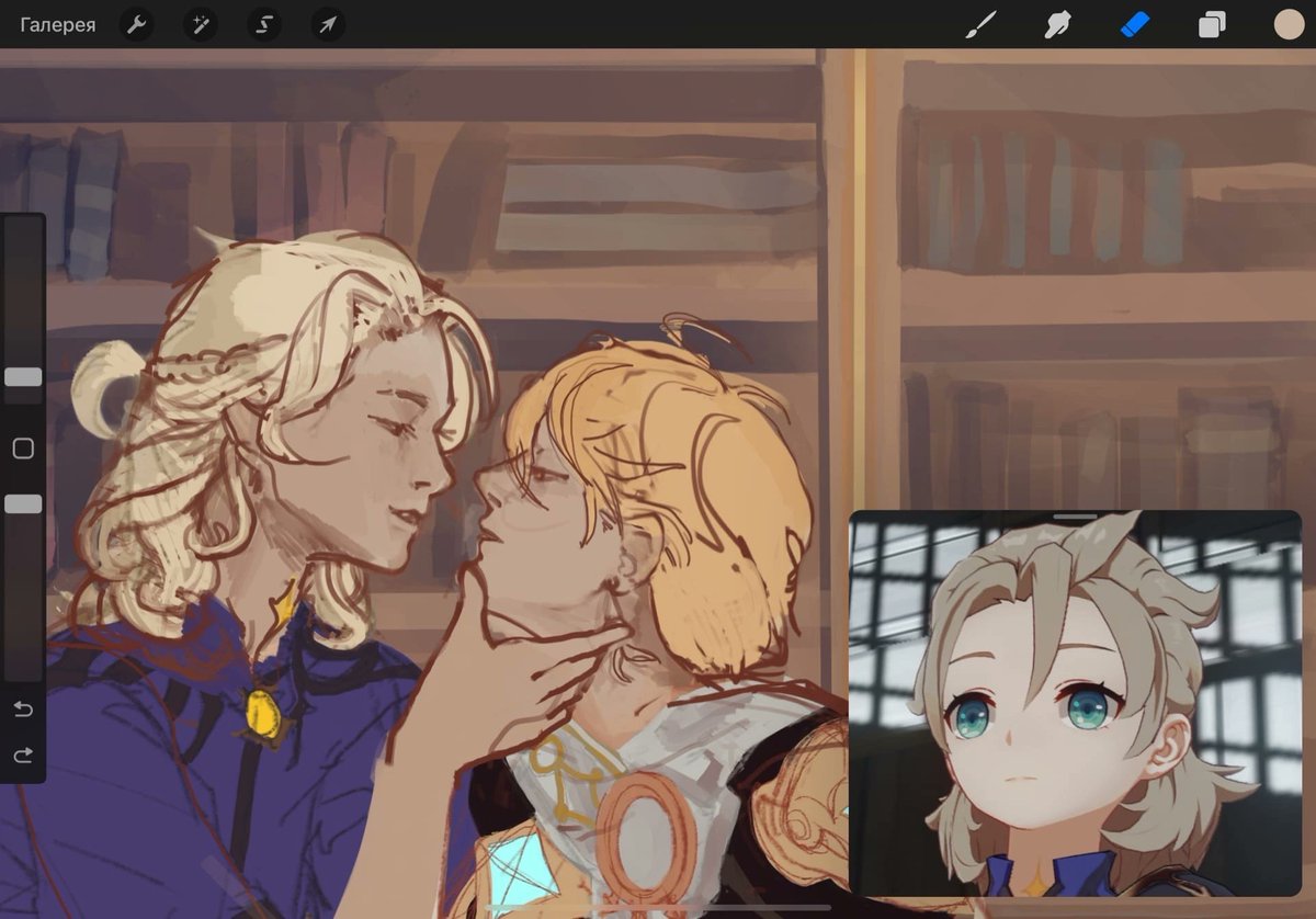 Уже довольно долго мучаю эту работу. Я уже кучу раз ее переделываю и вот наконец результат начинает радовать. #Genshinlmpact #genshinimpactfanart #Albedo #Aether #Albether #sketch #art