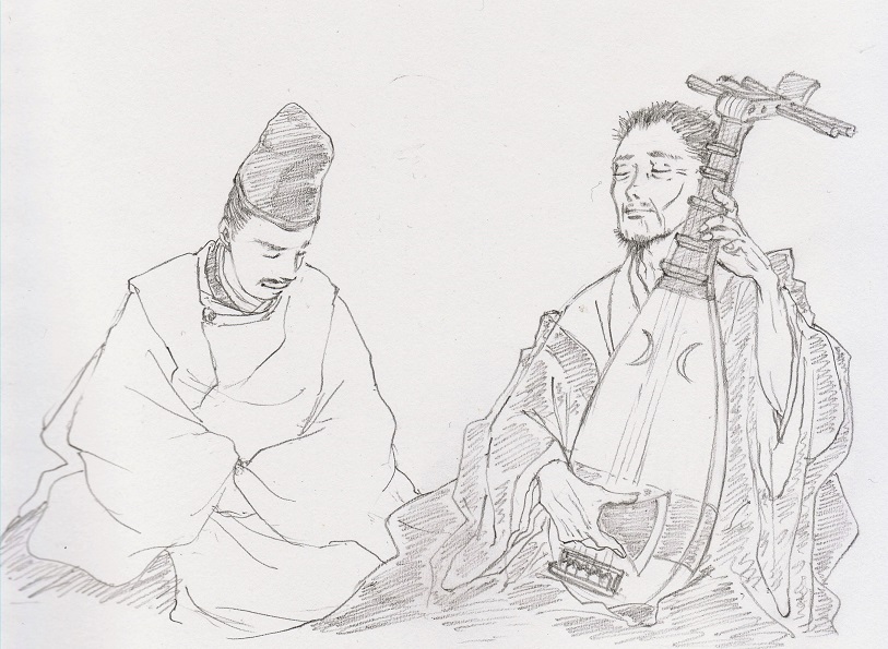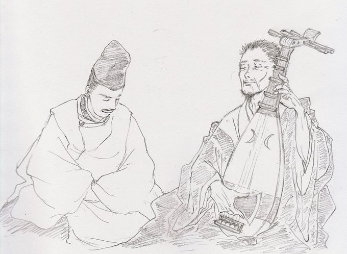 お題「継ぐ」 盲目の琵琶の名手・蝉丸の庵に3年通い秘曲が奏でられるのを待った源博雅。 月の美しい夜蝉丸が呟きます「哀れ興有る夜かな。若し我れに非ざる者や世に有らむ。今夜心得たらむ人の来かし」 博雅「王城に有る博雅と云者こそ此に来たれ」 秘曲伝来せり #歴創版日本史ワンドロワンライ
