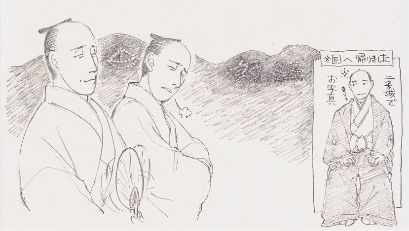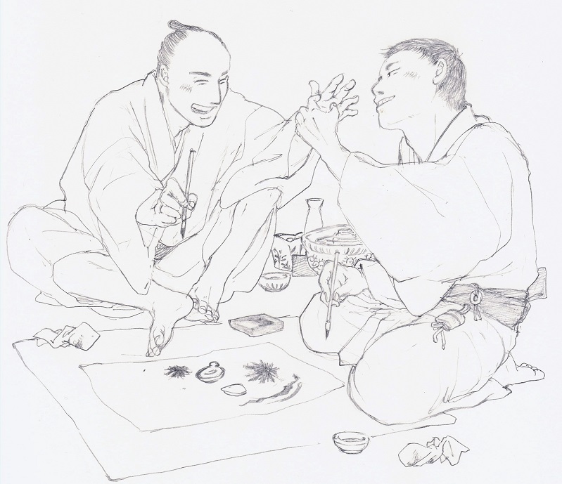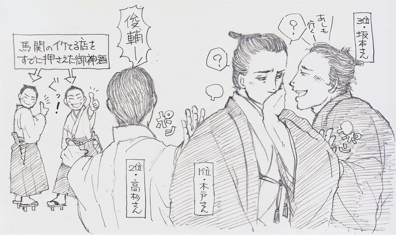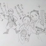 #今月描いた絵を晒そう 8月の落描き分から。 ・五山の送り火見学の春嶽公&宗城公+α ・酔っ払い「高杉東行」さんと「福田悠々」さん ・ご酒湯について(解説は大鳥圭介さんのお孫さんの大鳥蘭三郎さん) ・明治維新で活躍した人ランキングの結果によせて