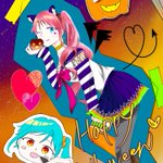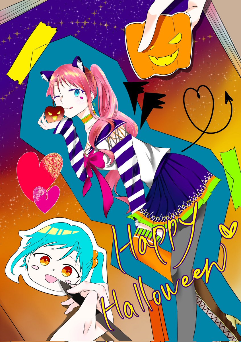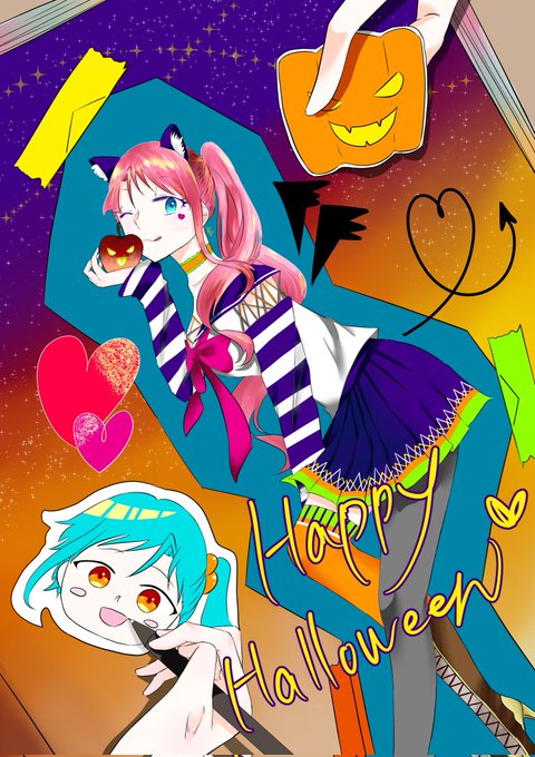 #COLORFUL_2wins #ハロウィンイラスト展示会2022 #ハロウィンイラスト2022 ❤️「ここにカボチャのシール貼れば完璧~!……え、何描いてるの???」 💙「俺のデフォルメの可愛い顔」 ❤️「……」(ドン引きの顔) 💙「マジな顔しなくてもよくない?」 雑誌のピンナップ風にアレンジしてる2人でした☺️