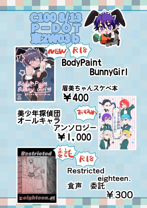 あなたのサークル「P-DOT」は、コミックマーケット102で「土曜日 東地区 “ピ” ブロック 01a」に配置されました!コミケWebカタログにてサークル情報ページ公開中です! webcatalog.circle.ms/Perma/Circle/1… #C102WebCatalog やっとサークルカット見つかりました。バニー本の続きを出したいです!