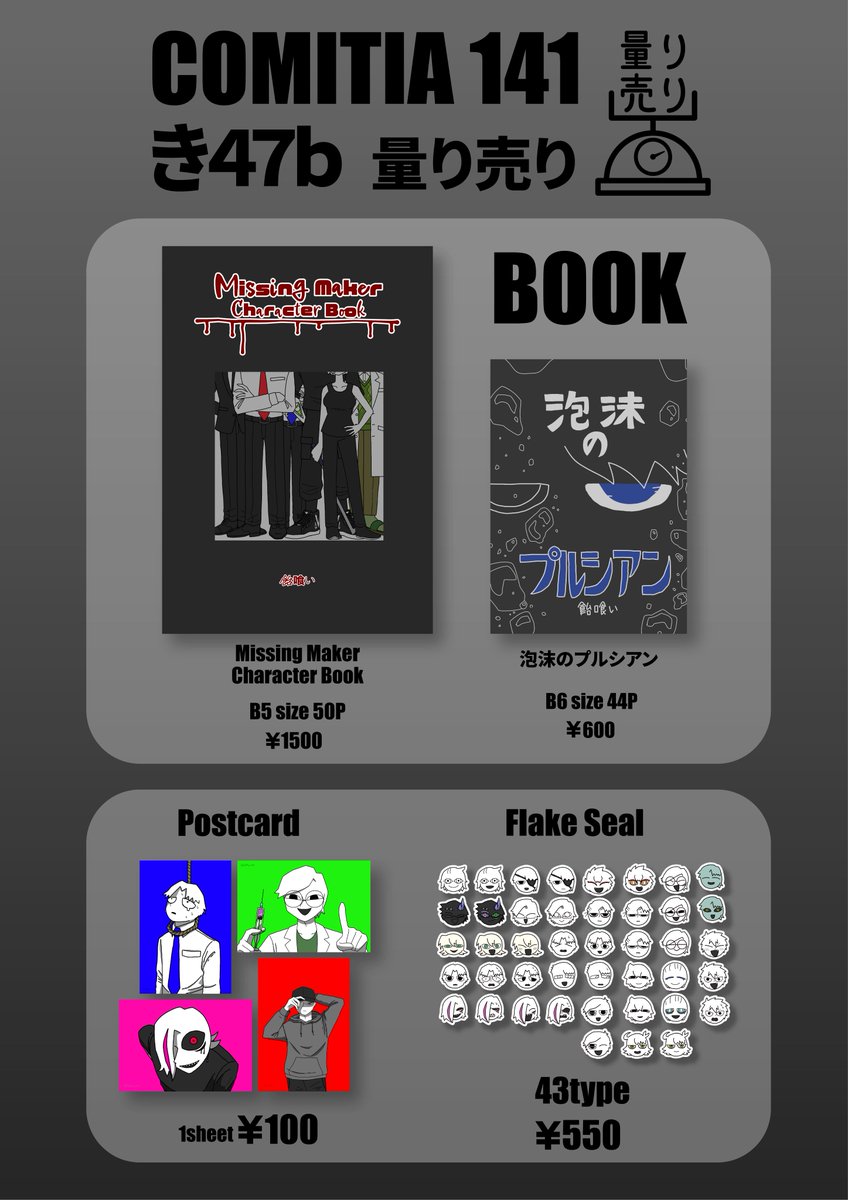 9月4日COMITIAお品書きです! 色をモチーフにしたキャラクター本、創作キャラクター紹介本と漫画、ポストカード、フレークシール、アクリルグッズと色々持って行きます!! #コミティア #COMITIA #COMITIA141 #お品書き
