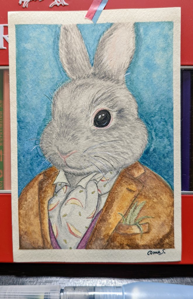「ネザーランドドワーフの肖像画」 アスコットタイに 乾燥りんごとペレットの柄を🍎 胸元にはチモシーを忍ばせて🌾 うさぎ好きさんなら伝わるはず🐰♡ #うさぎ好きさんと繋がりたい #イラスト好きな人と繋がりたい #水彩色鉛筆 #水彩画 #うさぎ #アナログイラスト #イラスト