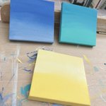 日中にやることぜーんぶ終わったので🤍 今から制作開始〜🌈✨ 今日は注文いただいたノートの限定特典🥳✨ミニキャンバスに空を描くよ😊💕わくわく 木の板にどんどん絵の具が着いていってる🫧これがまたいいんだなぁ🤤☂️ #制作 #イラスト