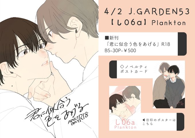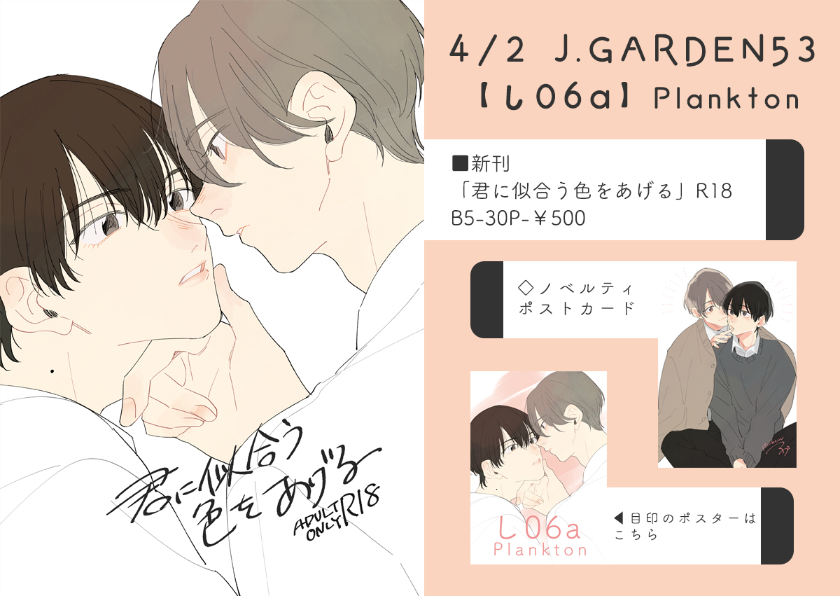 【4/2 J.GARDEN53 お品書き】 スペース: し06a [ Plankton ] ▽pixiv pixiv.net/artworks/10672… ▽サンプル pixiv.net/artworks/10672… #創作BL #J庭53