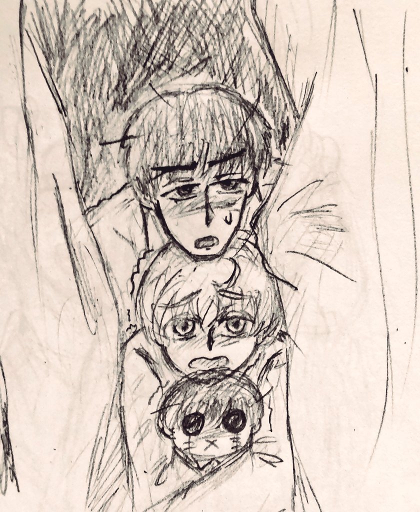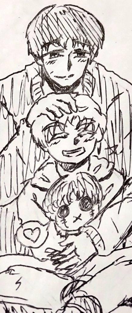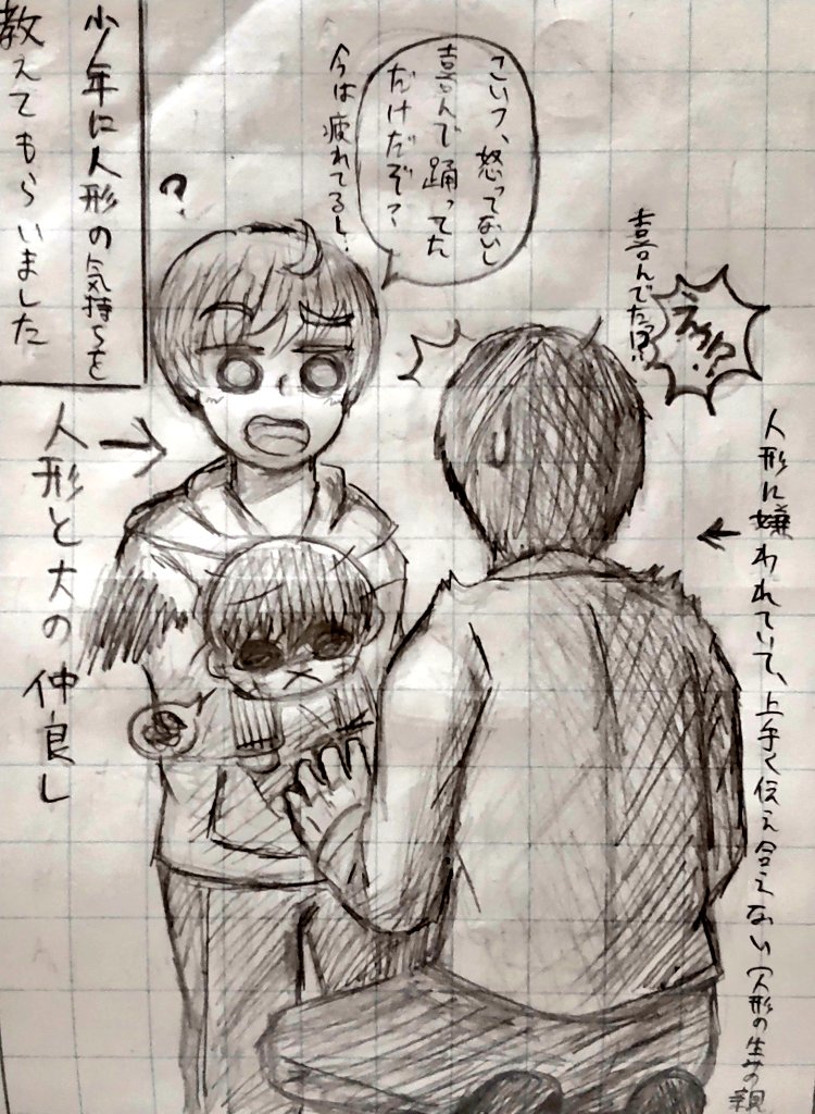 1 10 ①よく描いている、呪い人形 作られてから20年以上、押入れに放置されて呪いと化した人形 作りての青年を恨んでいたが、青年が保護した少年が押入れからだして仲良くなったため、一旦呪わず暮らしてる 言葉は話せないが、体を動かしてコミュニケーションをはかる やたらと動く #イラスト 22/10/25 18:28