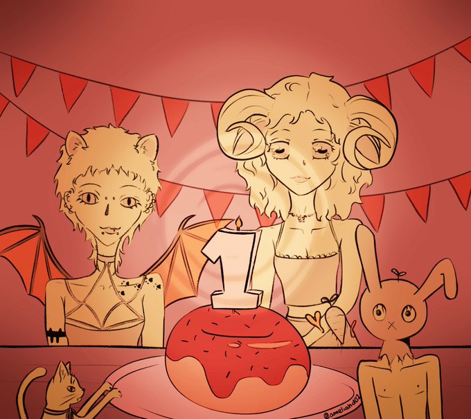 My OCs celebrating me getting over my fear of Twitter one year ago today 🎉 #Twitterversary #ArtistOnTwitter #digitalart