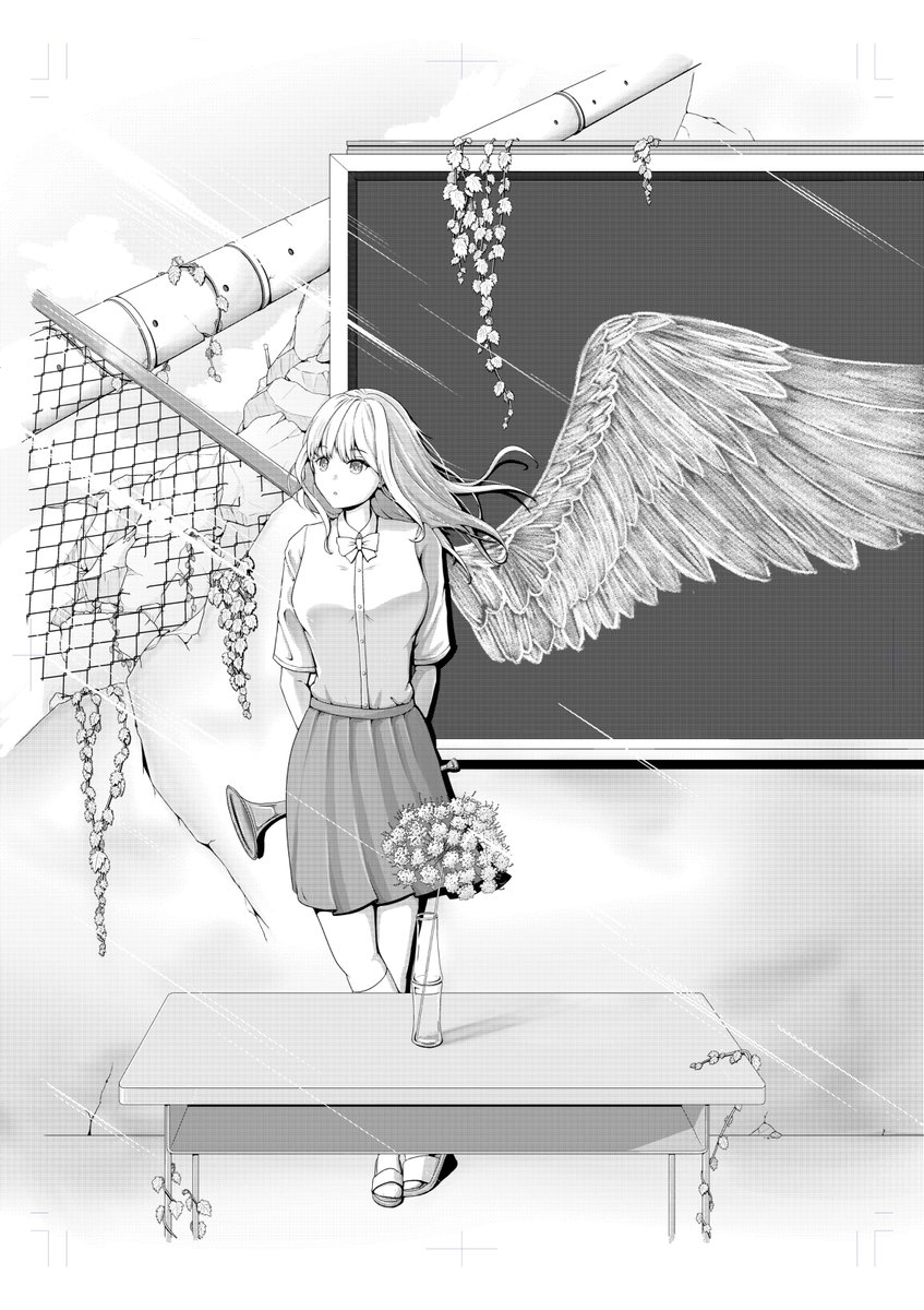 卒業制作進捗報告 モノクロ4 線画と黒塗りまで終わりました。 頑張れば来週の授業で完成近くまで持っていけそう #イラスト #イラスト進捗 #卒業制作