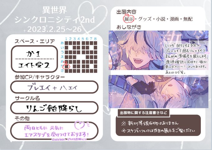 ぬ🦀webオンリー ブレエイスペースを頂いています~ おそらく何も間に合わない勢なので精一杯もりもりスケブを描きたいと思います…! #異世界シンクロニシティ #異世クロ2_カード
