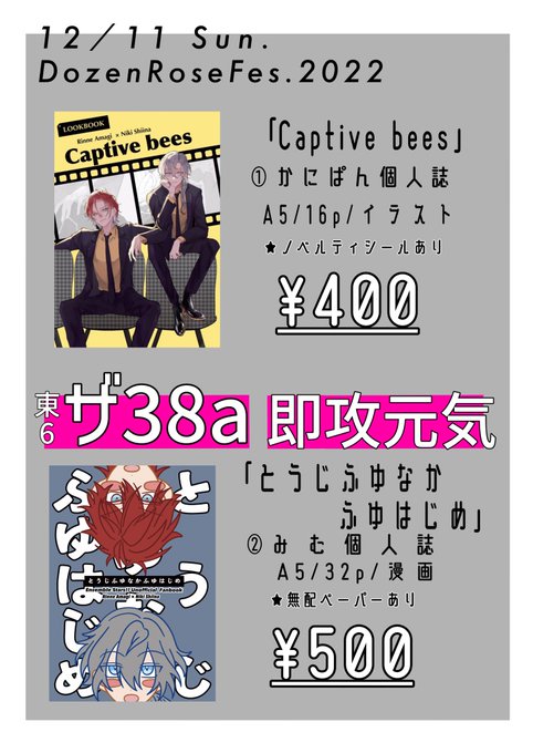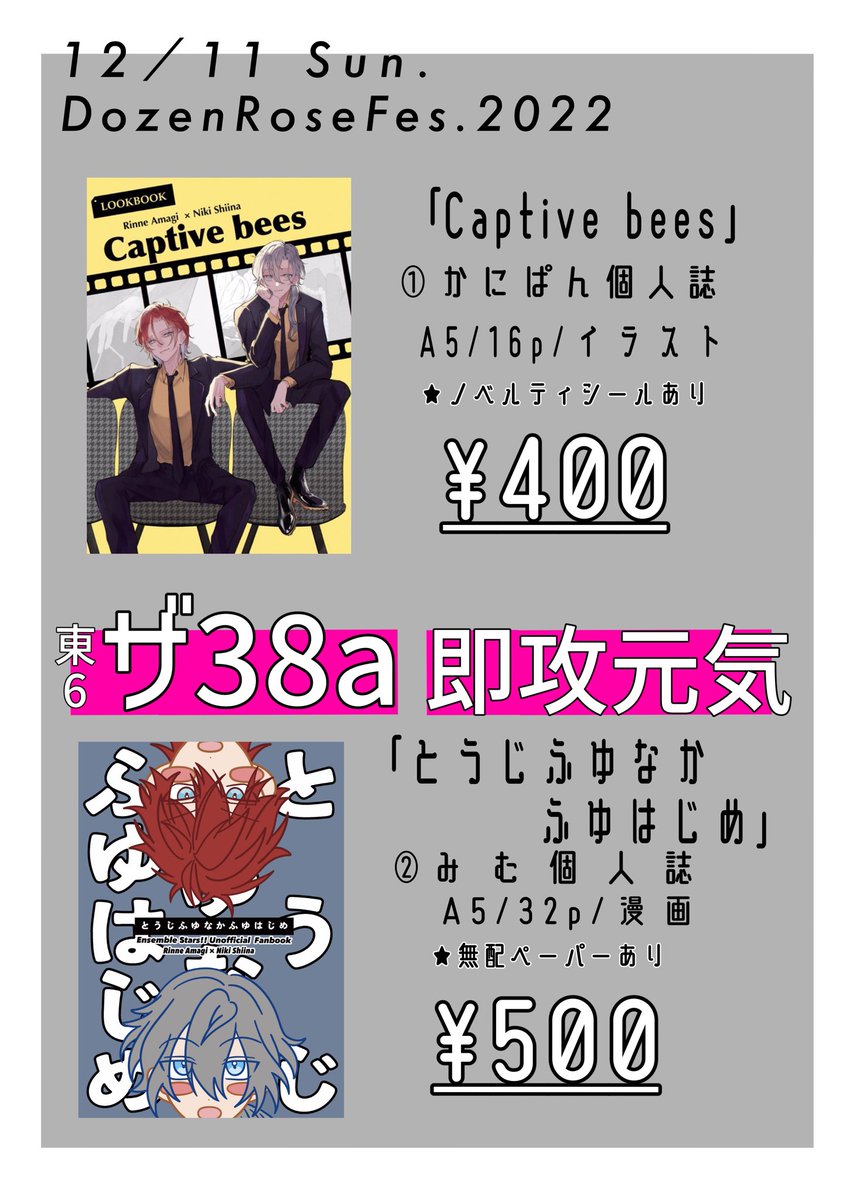 【12/11 DR2022お品書き】東6 ザ38a 燐ニキ みむさん(@mimuuu0141 )さんと合同サークルです! 新刊サンプル→ pixiv.net/artworks/10342… ノベルティと無配はツリーに↓
