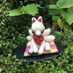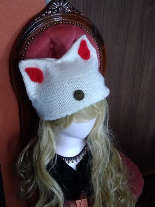 久々の棒針。狐耳帽を作ってみました。中耳はブローチタイプで取り外し可能。やはりモール糸が可愛いのでそちらで作るつもりです。#モノノケ市 #狐耳