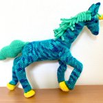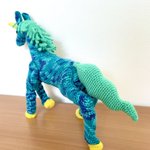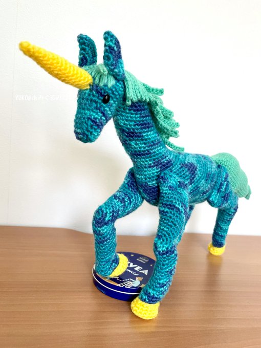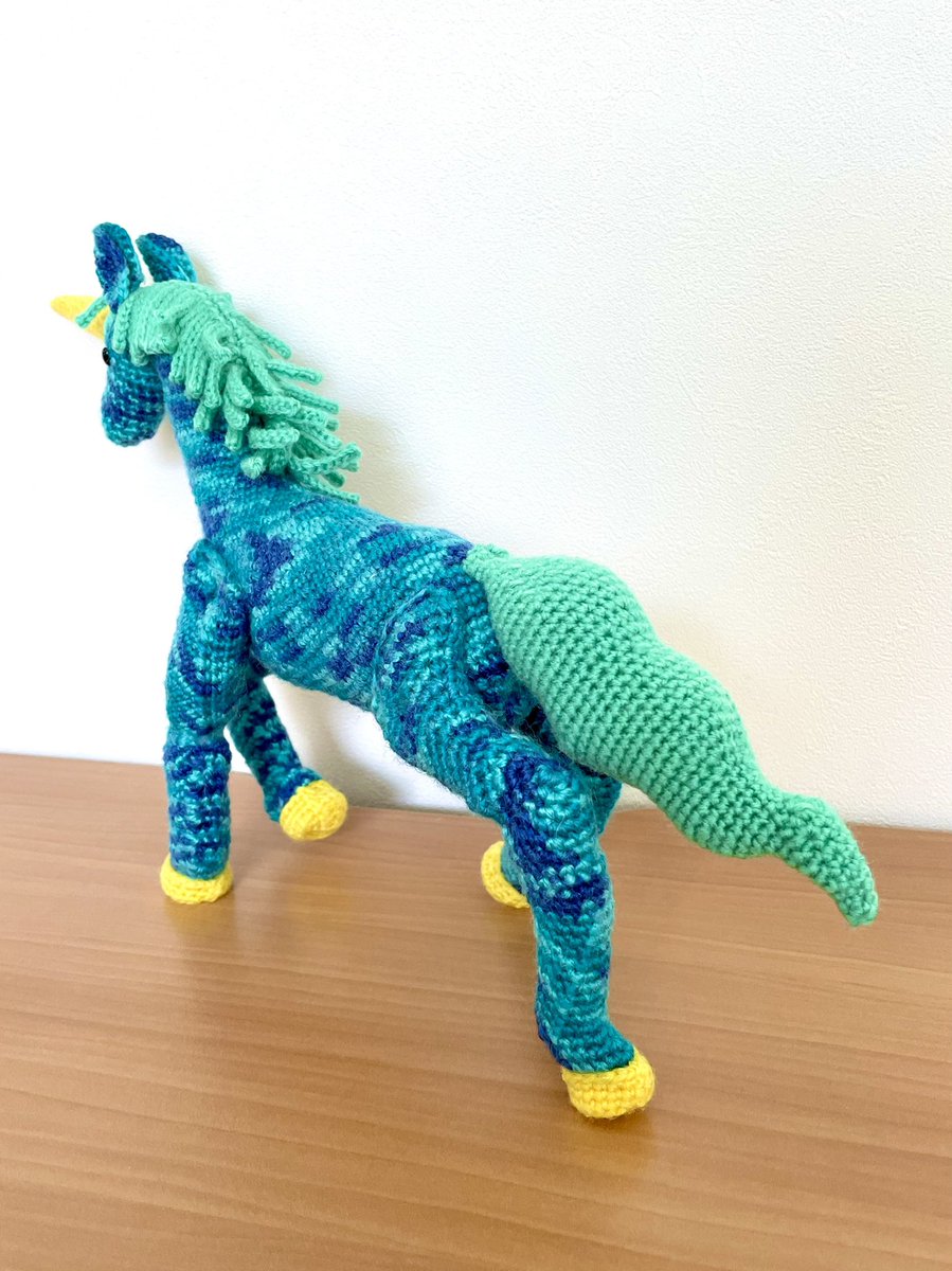 #ユニコーン を編みました。 頭→尻、四脚はそれぞれ一番角度のある部分からスタートして、シームレスに編んでいます。 #あみぐるみ No.88