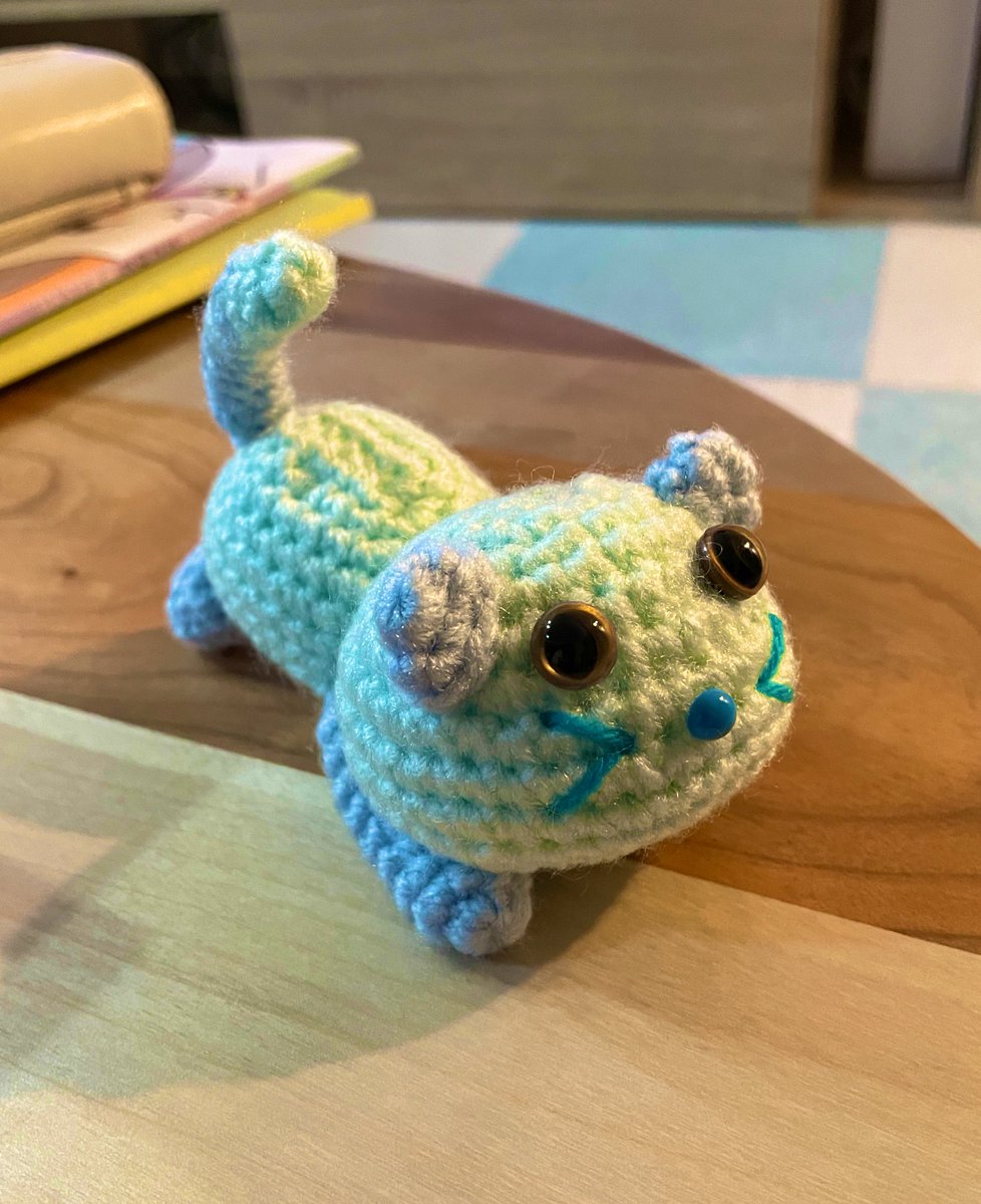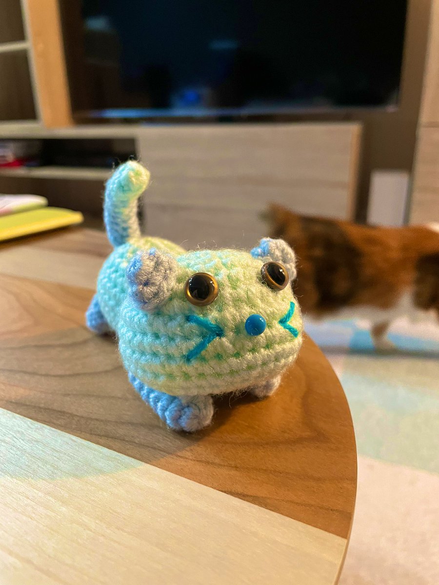 余った毛糸を組み合わせてあみました。名前はミントさんかな。 #ねこあつめであみぐるみ をベースに。 #あみぐるみ No.102