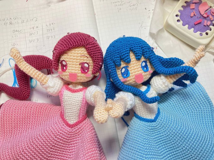 今まで編んだつぼみとえりか✨ 2人並べた時に身長差が出るようにするのが地味に難しいのです。